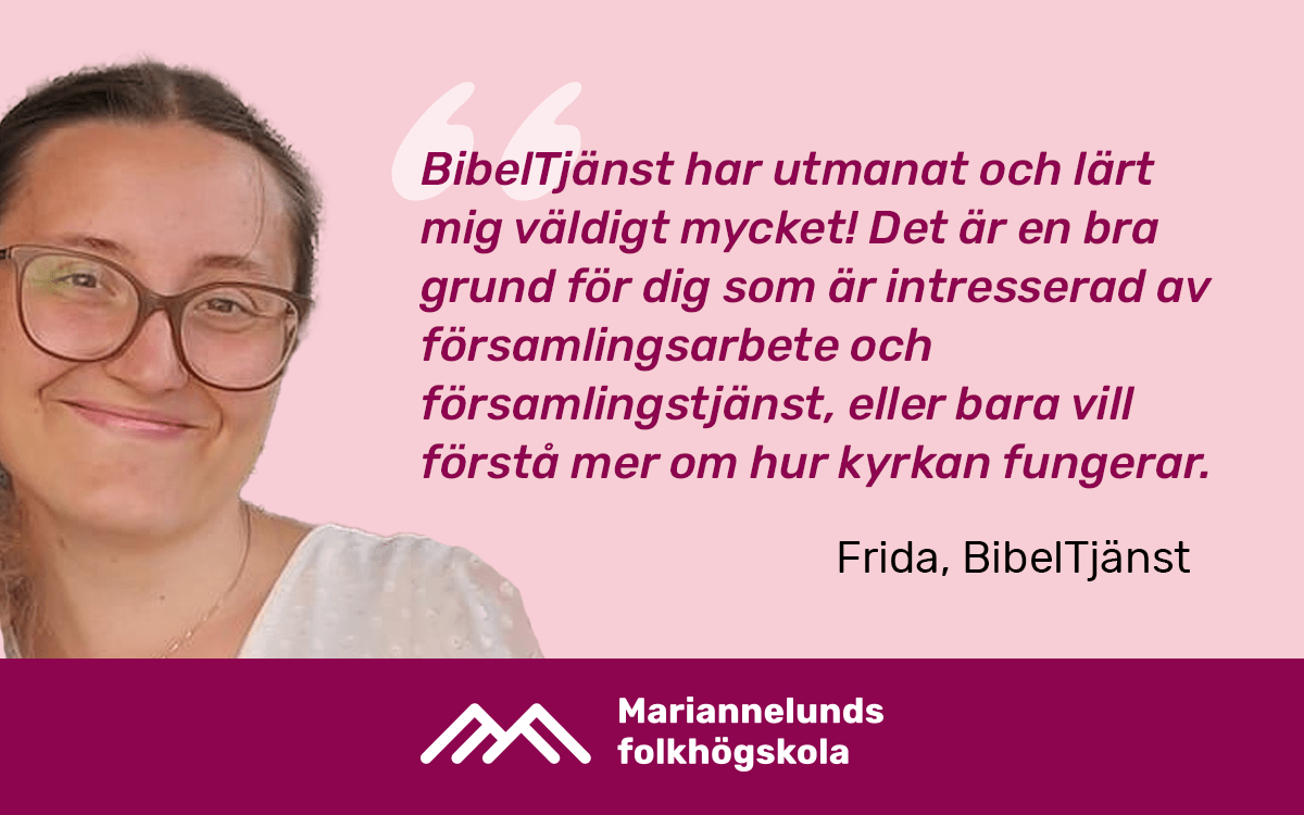 BibelTjänst är för dig som längtar efter att få komma i funktion i Guds rike, oavsett om det gäller i Sverige eller utomlands, församlingstjänst eller ideellt engagemang. Genom möten med människor i kursens praktiska delar samt fördjupade studier i Bibeln får vi en förståelse för hur evangeliet har relevans för vår tid. Kursen har fyra huvudområden: Församling, Ledarskap, Mission samt Ordet och Anden.