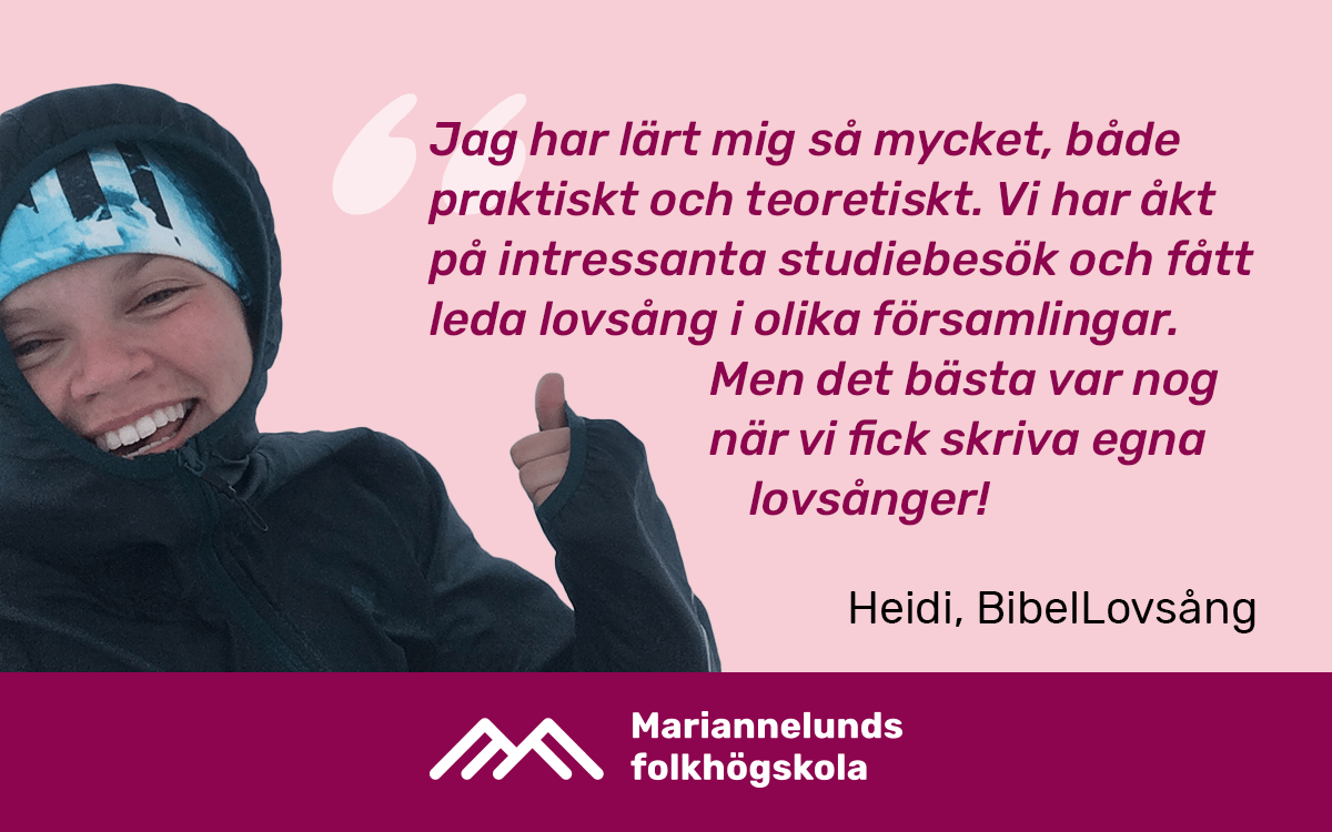 BibelLovsång är en kurs för dig som vill lägga en stabil grund för din kristna tro och samtidigt fördjupa din relation till lovsång och lovsångsledning. Kursen kombineras av ämnen där du får möjlighet att fördjupa dig i Bibeln, den kristna trons innehåll och den egna identiteten samtidigt som du också ägnar tid och reflektion i en fördjupning av lovsångens funktion och praktik. Kursen är för dig som har viss erfarenhet av lovsång och lovsångsledning men längtar efter att fördjupa dina kunskaper både teoretiskt och praktiskt.